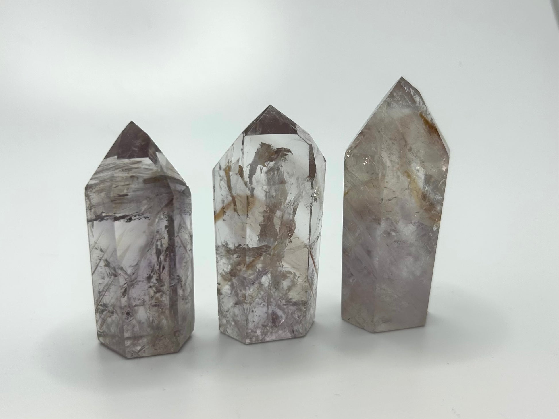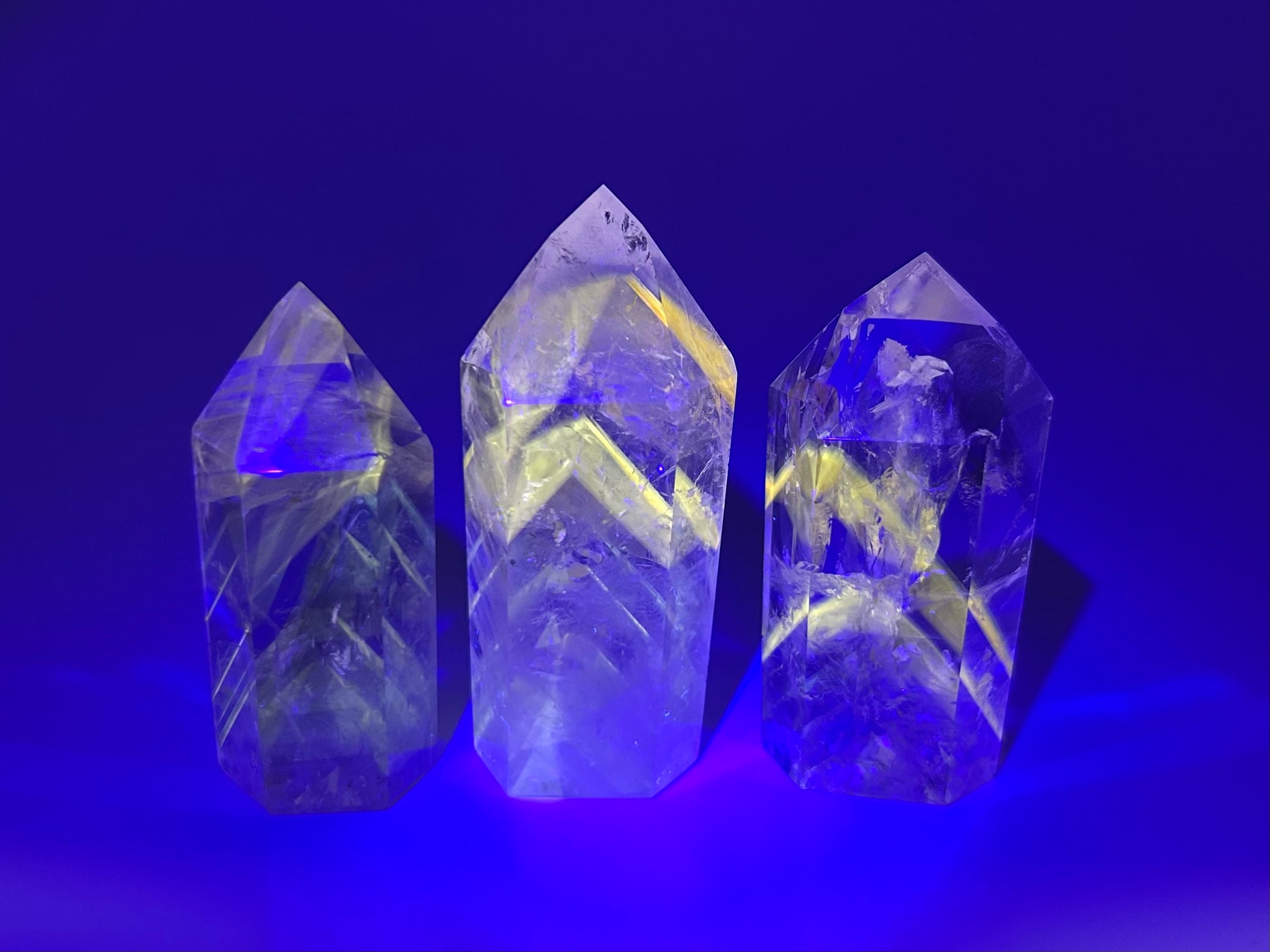 Amazing new find from Brazil! UV reactive powellite in Quartz points.